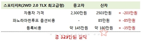 임씨가 구입한 스포티지R(2WD 2.0 TLX 최고급형)의 신차 가격은 2,503만원. 중고차 가격은 2,300만원으로 임씨가 자동차 가격으로 절약한 돈은 203만원이다.