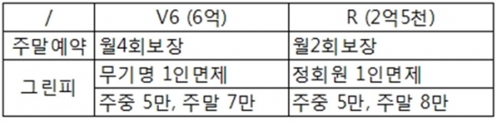 V6는 무기명 4인으로 주말예약 월 4회를 보장하며, 무기명 1인은 그린피가 면제되고 나머지 3인은 주중 5만원, 주말 7만원이다.