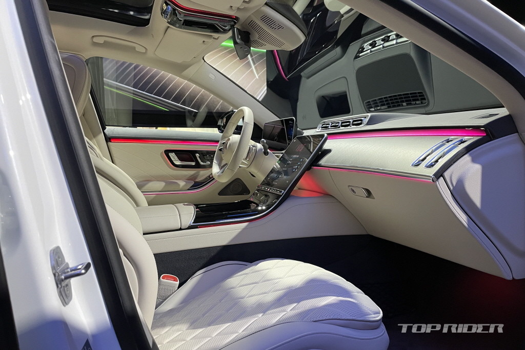 실내에는 12.8인치 OLED 센터페시아 디스플레이와 12.3인치 3D 계기판이 적용됐다. 공조기를 포함한 대부분의 차량 제어 기능이 12.8인치 디스플레이에 통합됐다. 증강현실 내비게이션과 함께 지문, 얼굴, 음성인식을 비롯한 생체 인증 방식이 MBUX에 도입됐다.