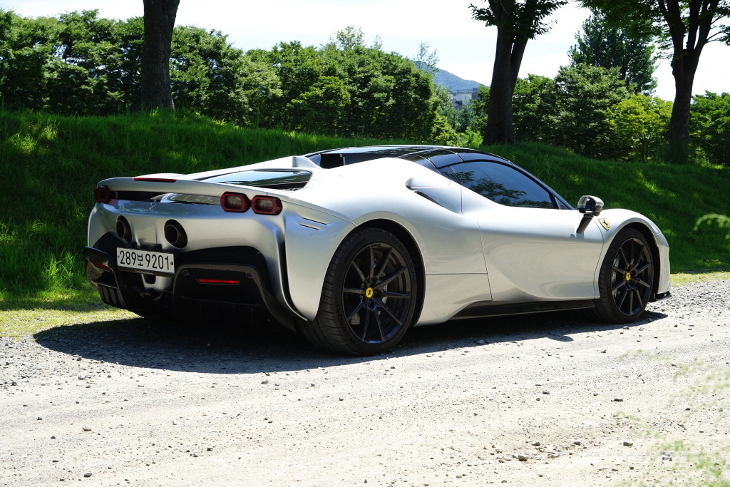 SF90 스파이더의 외관은 아름답다. 낮고 와이드한 보디의 존재감은 사진으로 담아내기 어렵다. 실물을 접하면 모두의 시선을 사로잡을 만큼 매력적이다. 특히 실버 컬러의 색감이 꽤나 매력적인데, '페라리=레드'라는 공식을 적어도 SF90 스파이더에서는 예외로 해두고 싶다.