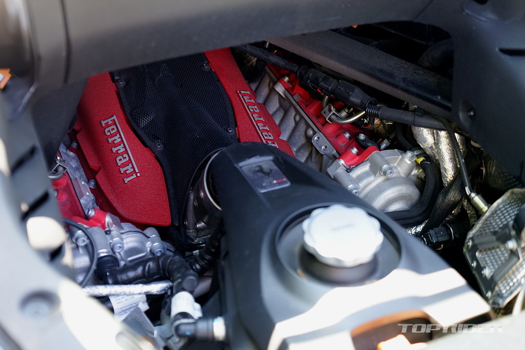 90도로 벌어진 V8 엔진은 드라이 섬프 냉각 시스템을 사용하고, 엔진 리스폰스 향상을 위해 전자식 웨이스트게이트를 적용했다. 터보차저 시스템의 적용이 초기 터보랙을 만들어내고, 배기사운드에 악영향을 미친다는 편견은 페라리의 최신 엔진에는 적용되지 않는다.