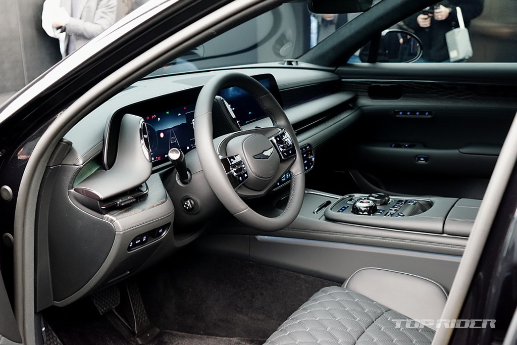 내장은 전용 세미 아닐린 시트 커버링 및 퀼팅, 노브 및 스위치류, 리얼 우드 가니쉬, 알루미늄 스피커 커버는 물론, 후석 통합 컨트롤러(CCP, Central Control Panel)의 측면 아랫 부분 등 눈에 띄지 않는 부분까지 블랙으로 표현해 최고급 모델에 걸맞은 세심함을 더했다.