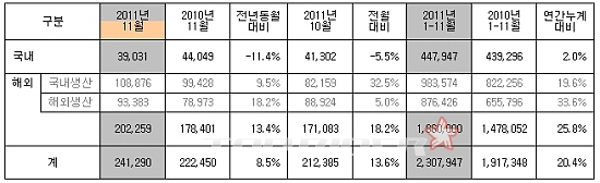 국내판매는 K5의 원활한 물량 조달과 신형 프라이드와 모닝 등 신차들의 판매가 호조를 보였지만 전체적인 산업수요 감소로 전년대비 11.4% 감소해 지난 10월 4.3% 감소한 데 이어 2개월 연속 하락했다.